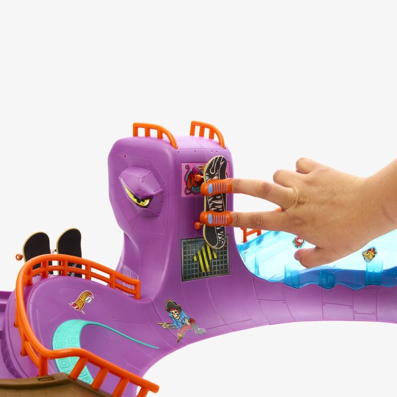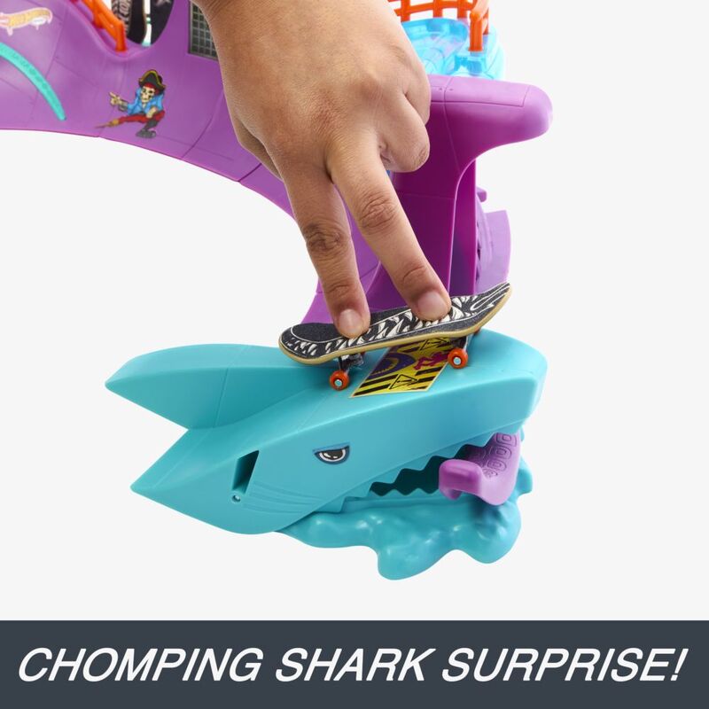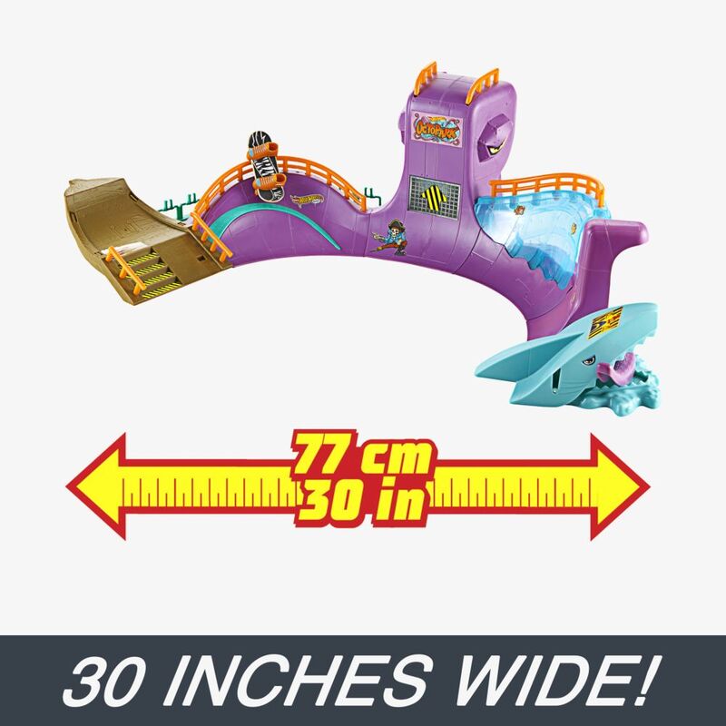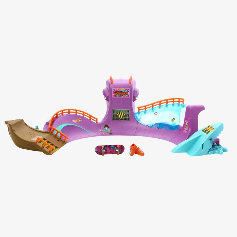 Grind the rails and nail tricks in the Hot Wheels Skate Octopark Skate Set!The octopus-themed set's features grind rails, vert quarter-pipes, stairs, bowls and ledges for abundant skate surfaces and open-ended play. There's even a shark with a board-activated chomping feature!It includes an exclusive, fully assembled board and a pair of removable skate shoes to help beginners learn to master tricks.The back of the set holds 4 fingerboards and 6 pairs of skate shoes to have additional looks on-hand. (Additional boards and shoes sold separately.)Makes a great gift for finger skateboarders and sneakerheads 5 years old and up.