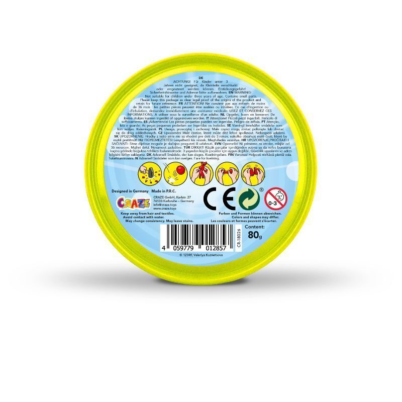 The intelligent modeling clay does not dry out, is unbreakable, absolutely odorless and leaves no traces. CRAZE MAGIC DOUGH flows, tears, can be easily shaped, breaks, can be cut, is extremely elastic and bounces and jumps like a bouncy ball. Magic Dough in the special effect yellow Glow in the Dark.