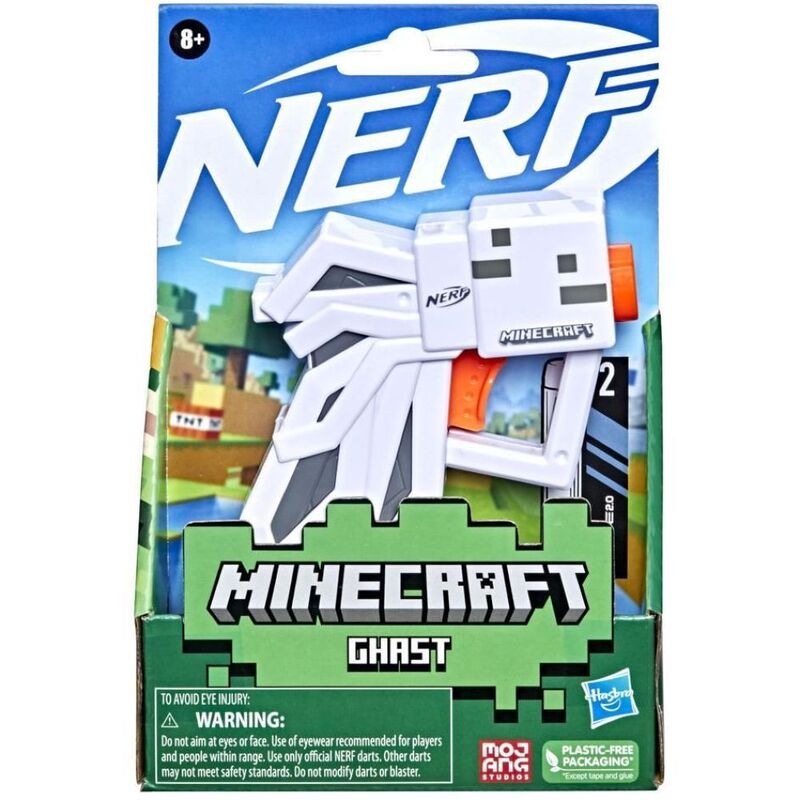 Blast into big fun with this mini-size Nerf MicroShots Minecraft Ghast dart blaster that captures the look of the ghast mob from the Minecraft video games! The compact size makes it easy to carry and fun for all your indoor and outdoor Nerf battles. This single-shot Nerf MicroShots Minecraft blaster fires 1 dart at a time and is quick and easy to use. Load 1 dart into the front of the blaster, pull down the priming handle, and press the trigger to button. It's a great addition to Nerf and Minecraft collections and the perfect gift for Minecraft fans and Nerf players! Includes 2 Official Nerf Elite foam darts that are tested and approved for performance and quality. Eyewear recommended (not included). No batteries required. Also look for Nerf MicroShots Minecraft Guardian and Ender Dragon mob designs (each sold separately, subject to availability). Copyright 2022 Mojang AB. TM Microsoft Corporation. Hasbro and all related terms are trademarks of Hasbro.
