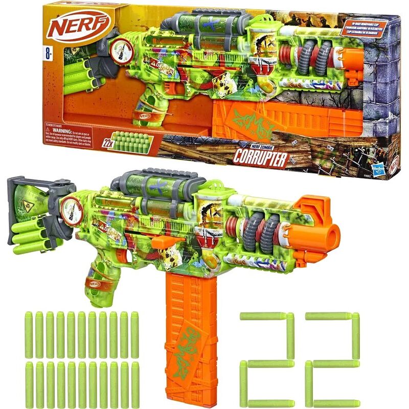 - NERF ZOMBIE CORRUPTER DART BLASTER: The Nerf Zombie Corrupter dart blaster features graffiti decorations on both sides and a cool design that captures the look of battle equipment created by inventive zombie fighters
