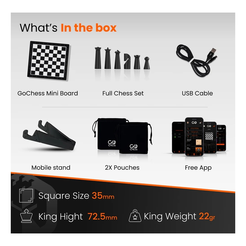 GoChess Mini delivers the perfect fusion of traditional chess, cutting-edge technology, AI, and portability. All in a slim, premium board, designed for chess lovers wherever they go.