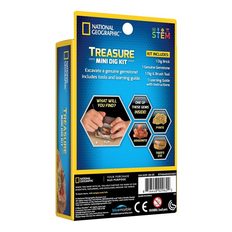 The National Geographic Treasure Mini Dig Kit makes geology surprising and fun! That’s because you won’t know if a pyrite, aragonite, or tiger’s eye specimen is inside until you dig! Use the included dig tool and brush to excavate, then learn about your new treasure in our full-color learning guide