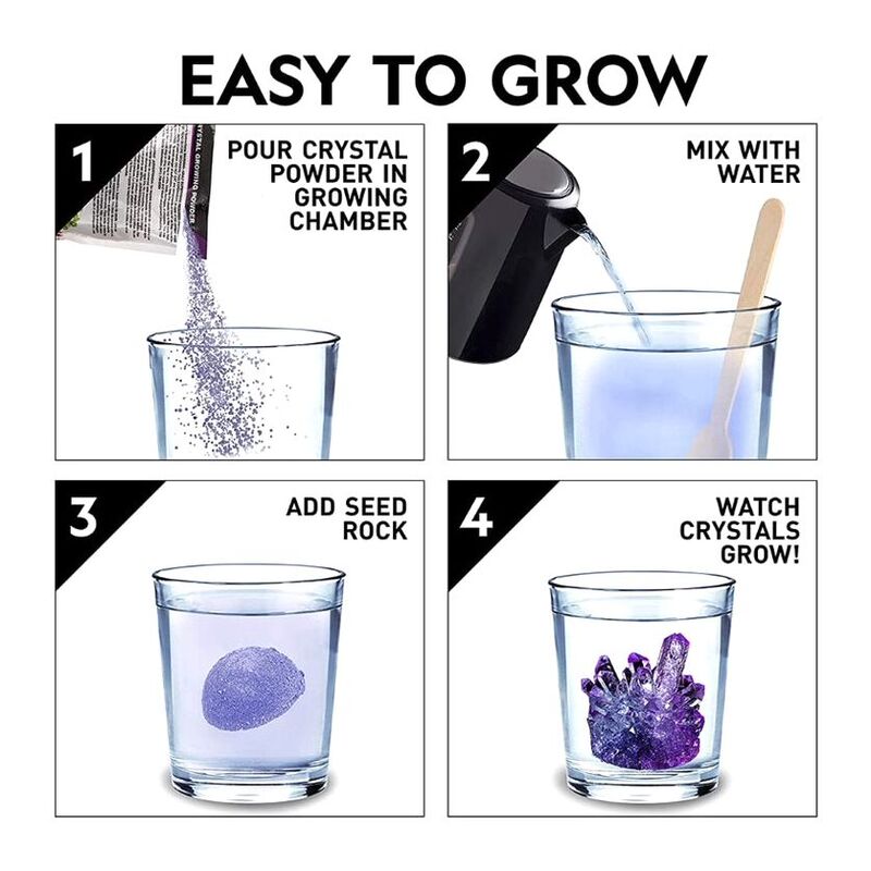 Grow 3 incredible crystals in as little as 3-4 days! Then display your favorites on a stunning light-up base, which has 7 colors and 3 different light display patterns to choose from. A full-color learning guide is also included, with lots of amazing facts about crystals.
