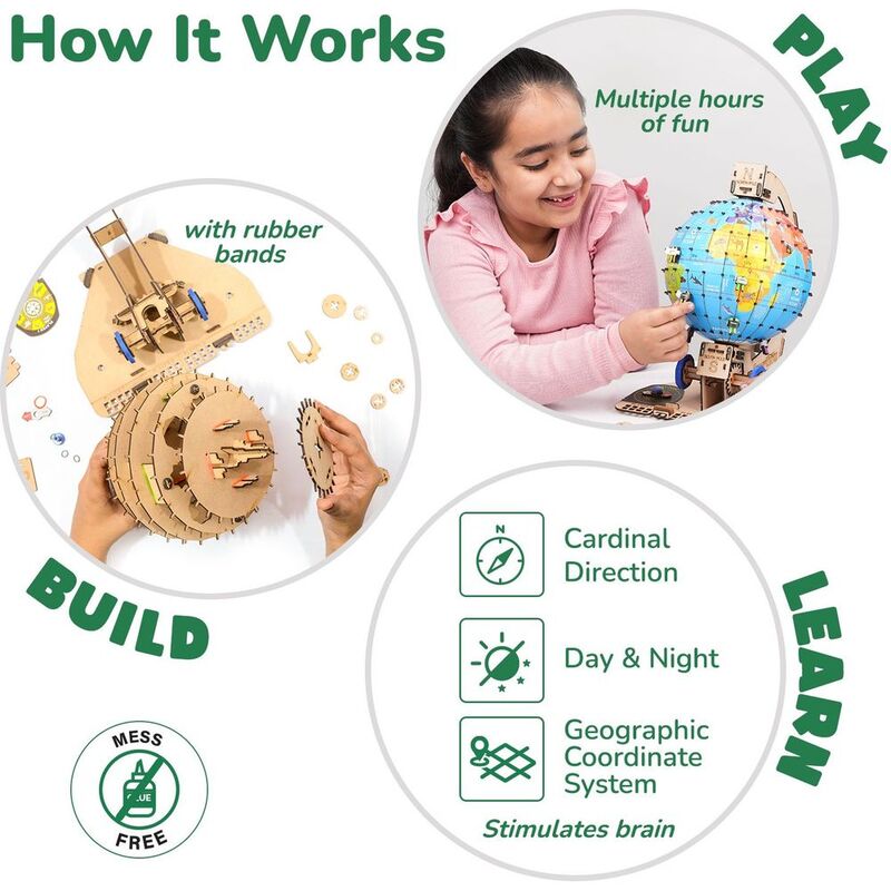 Build-It-Yourself Globe with a Mechanical Rotator Mechanism, Latitude - Longitude spinners, and 2 dice (Mode of Transport, Number Of Moves).; Screen Free Fun : Longer Constructive Activity,Multiple Gameplays,Core STEAM Learning and Superior Engagement Time other than DIY toys.