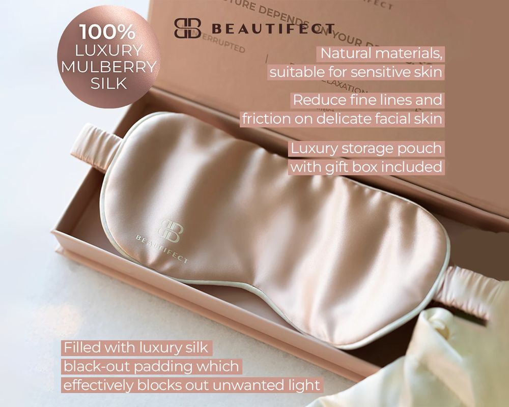 Nothing says luxury like Silk, especially pure 100% Mulberry Silk. With a comfortable cushioned design to sit softly against your face. The Beautifect Silk Eye Mask gently protects delicate skin and is specially filled with luxury silk black-out padding which effectively blocks out unwanted light for the ultimate undisturbed beauty slumber.
