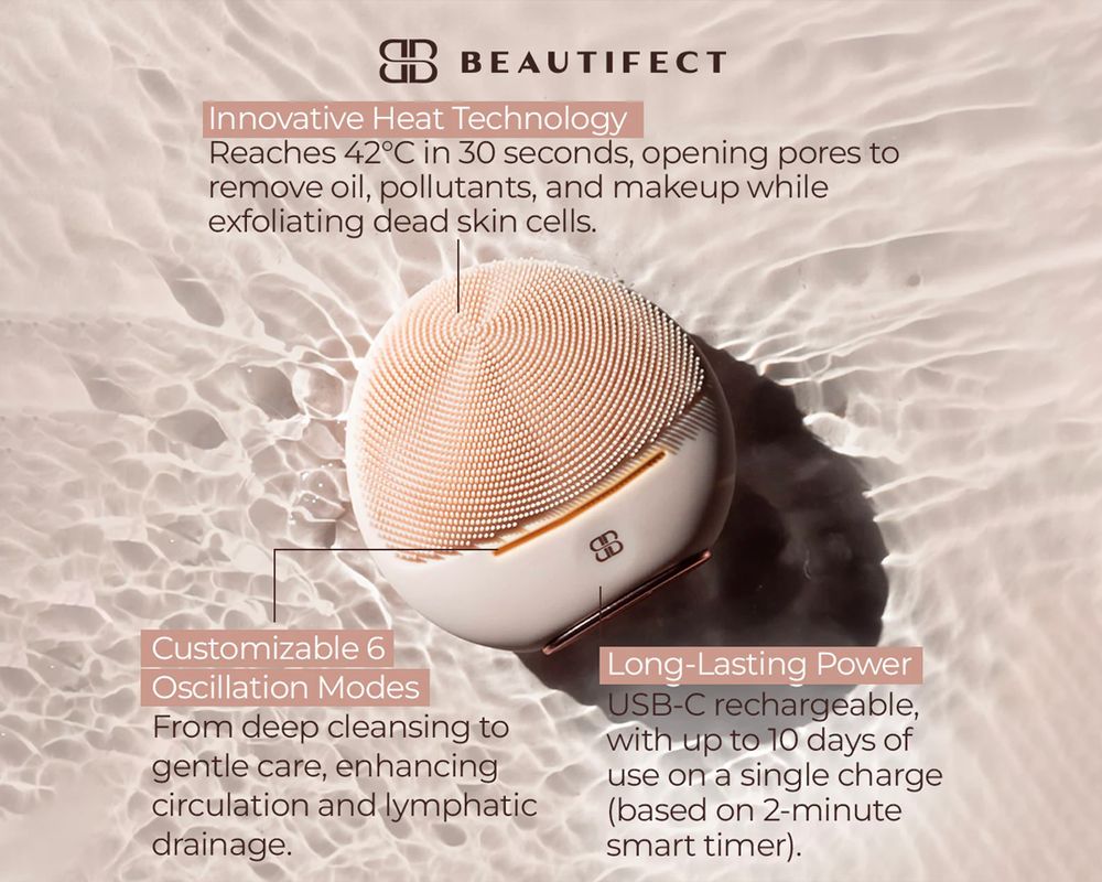 Unveil your most radiant skin with the Beautifect HeatSonic Cleansing Device. Designed to elevate your skincare routine, this innovative device offers multiple benefits that transform your complexion. The HeatSonic uses thermal cleansing technology to reach 42°C in just 30 seconds, opening pores to effectively remove excess oil, pollutants, and makeup while gently exfoliating dead skin cells. This process enhances skincare absorption, ensuring your favorite products work more efficiently.