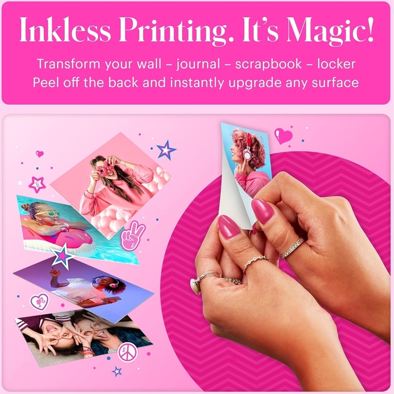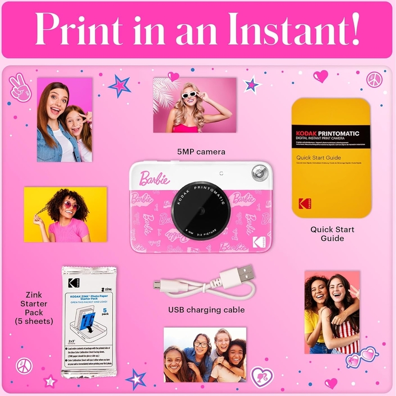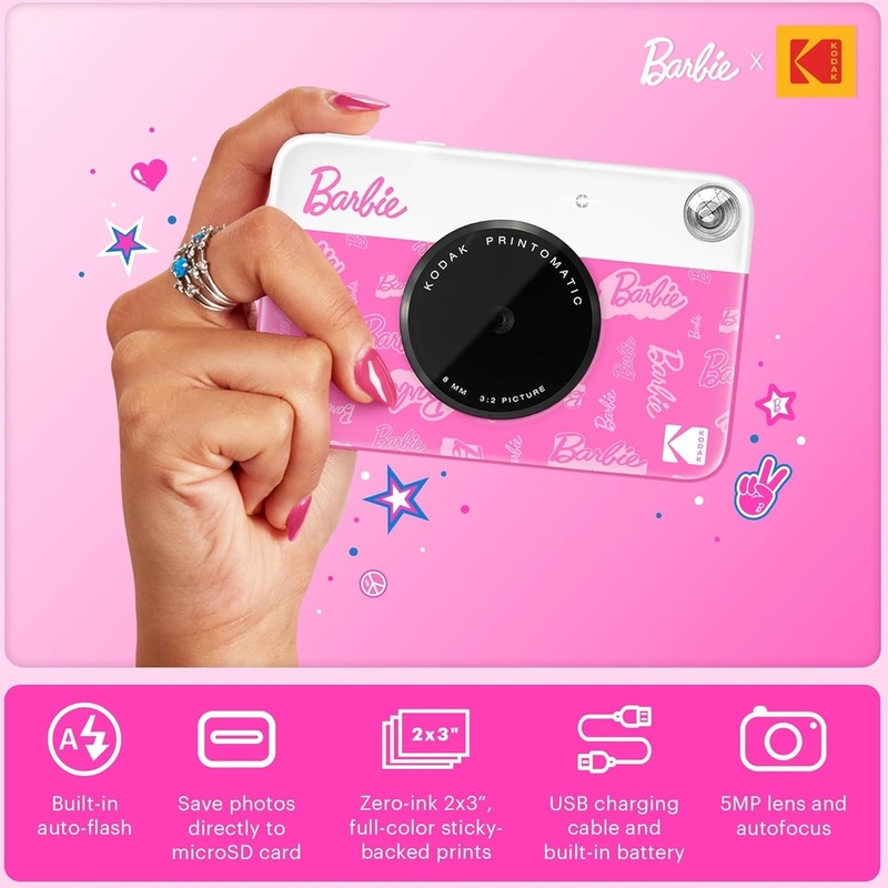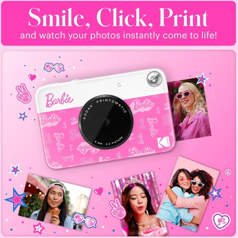 Say hello to the Barbie x Kodak instant camera! This fabulous, iconic Barbie camera instant print is your ultimate sidekick for instant fun. Just point, shoot, and watch as it prints ZINK Zero-Ink smudge-proof, water- and tear-resistant photos in a flash. It’s so speedy you can snap new pics while the previous ones are still printing! Slip this pocket-sized Barbie instant picture camera into your bag or back pocket and get ready to make instant 5MP memories wherever you go. The built-in viewfinder of the portable camera makes framing your shots a breeze, while auto-focus and flash ensure your photos turn out perfectly every time. Plus, with ZINK Zero-Ink technology, you get vibrant, full-color 2x3” photos with an adhesive backing—no messy inks or cartridges required. Stick your memories anywhere, anytime, and keep the Printomatic instant photo camera magic alive!