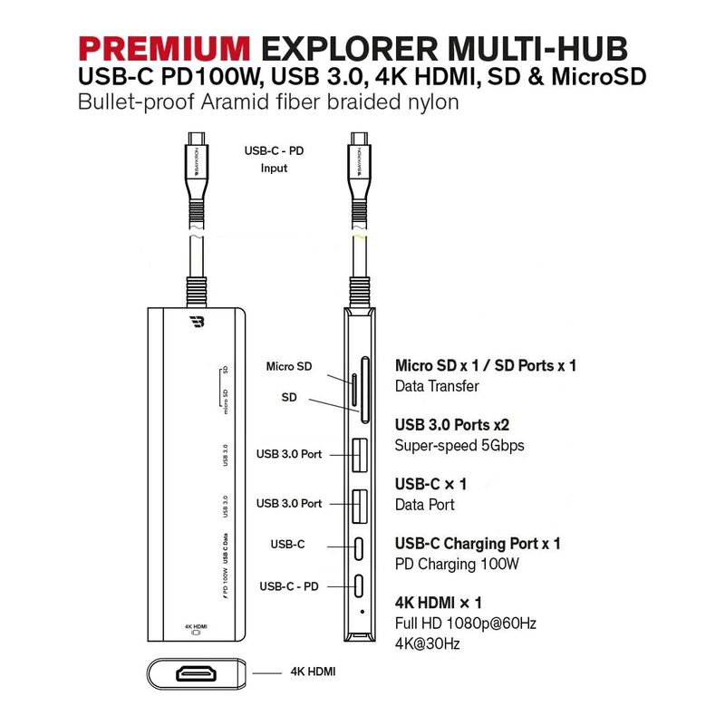 BAYKRON Premium Explorer 7 in 1 Multi-Hub, Plug and Play compatible with video-enabled USB-C or Thunderbolt ™ 3 MacBook, Chromebook, Windows, computer, smartphone, or tablet with Display Port Alt mode to provide stunning 4K clarity and sound. Travel charger docking connect and charge new and legacy devices no matter where you are. The slim, compact Baykron USB-C 7-in-1 Explorer hub offers multiple options and fits in any pocket ready to go.