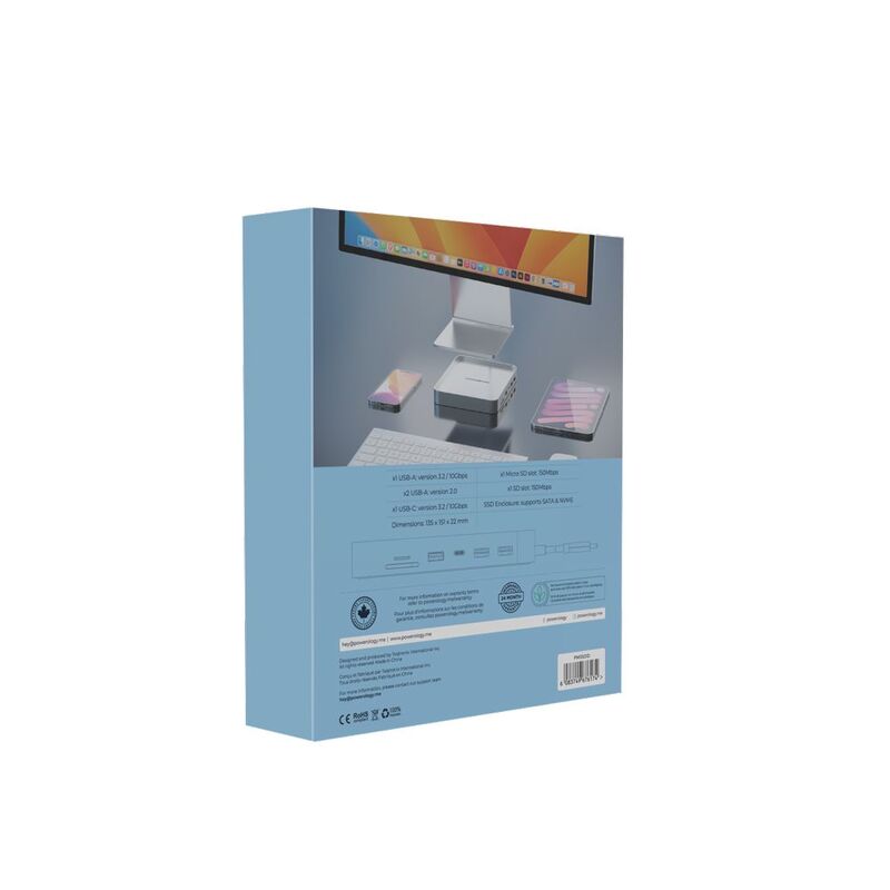The Powerology 24"" iMac Compatible USB-C Hub & Stand with SSD Enclosure is a versatile and efficient accessory designed to enhance your iMac experience. With its sleek aluminum frame and non-slip base, it offers both stability and style. The hub provides multiple connectivity options, including 1 USB-A 3.2 port and 1 USB-C 3.2 port, each capable of 10Gbps transfer speeds, along with 2 USB-A 2.0 ports for additional peripheral connections. Moreover, the integrated Micro SD slot and SD slot offer convenient data access at 150Mbps. The standout feature of this hub is the SSD enclosure, which supports both NVMe and SATA drives up to 2TB, allowing you to expand your iMac's storage capacity effortlessly. Whether you need faster data transfer, more device connections, or increased storage, this Powerology USB-C hub and stand is the ideal companion for your 24"" iMac setup.