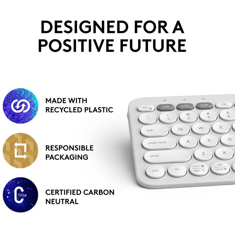 We don’t just stop at a unique design, we make sure that our products are responsibly made too. The Pebble Keys 2 comes in a range of colors made with more than 45% recycled plastic 18Pebble Keys 2 K380s plastic content: minimum 49% recycled plastic, excluding plastic in printed wiring assembly (PWA) and packaging so you can choose a color that fits your vibe.
