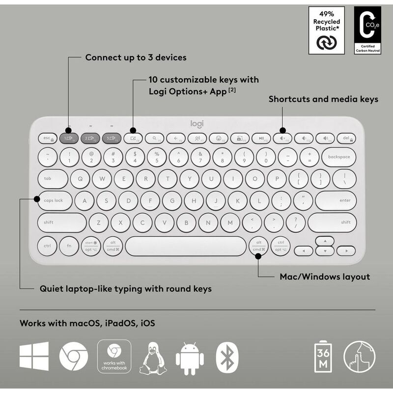 Switch between 3 of your devices with a press of the Easy-Switch buttons. Compatible with Windows, macOS, iPadOS, iOS, and Android.