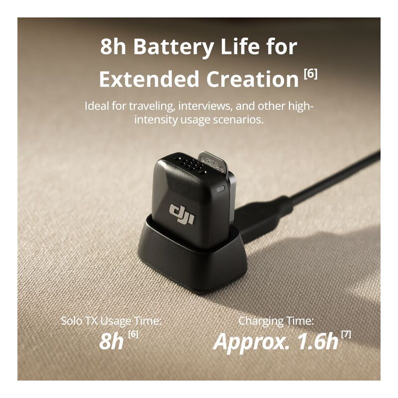 A transmitter and a receiver offer a maximum operating time of 11.5 and 10.5 hours, [6] respectively. A fully charged case provides approximately 3.6 full charges to achieve a total of 48 hours of extended use. [1] This makes the DJI Mic Mini ideal for long trips, interviews, and other intensive usage scenarios.