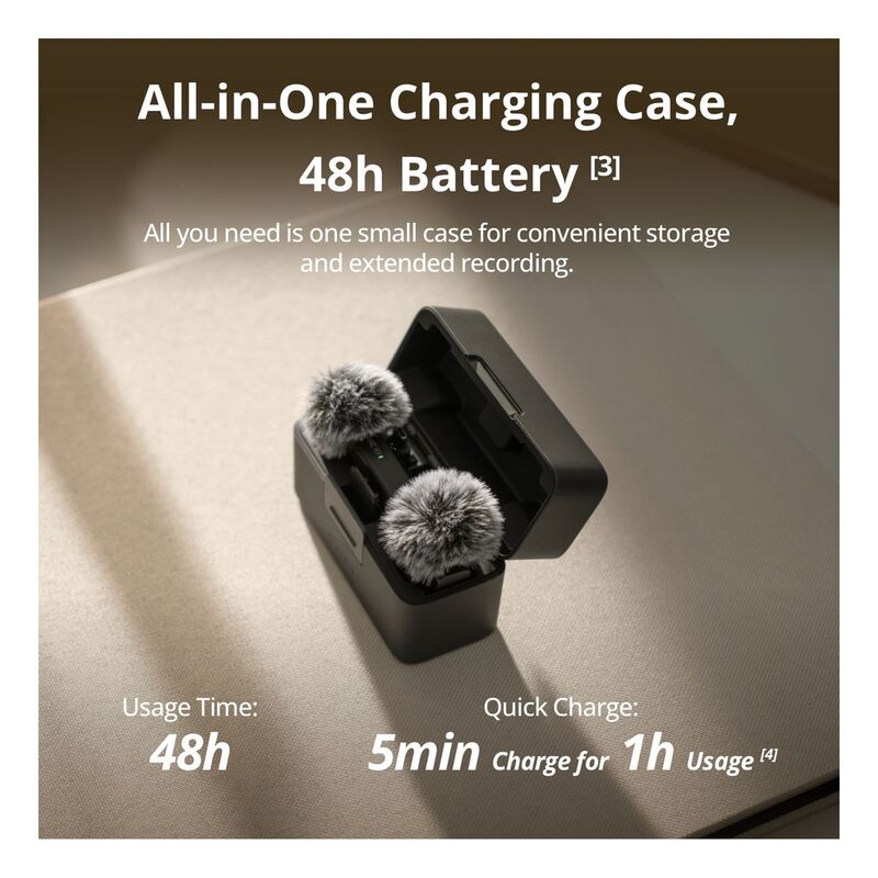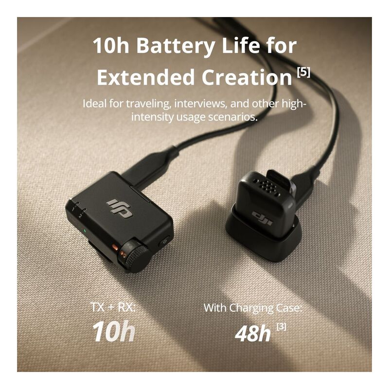 A transmitter and a receiver offer a maximum operating time of 11.5 and 10.5 hours, [6] respectively. A fully charged case provides approximately 3.6 full charges to achieve a total of 48 hours of extended use. [1] This makes the DJI Mic Mini ideal for long trips, interviews, and other intensive usage scenarios.