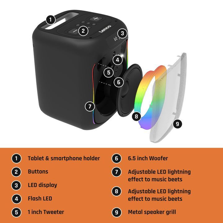 The Lenco PA-100BK is a portable Bluetooth® party speaker with customizable and music-controlled LED lighting effects on the front. The powerful class D amplifier with X-drive mode has an output power of 100 Watts RMS. With this output power, you can be sure that your music will make an impression. The 6.5" woofer and 1" tweeter also provide powerful deep bass and clear high tones, resulting in an impressive and balanced sound profile.