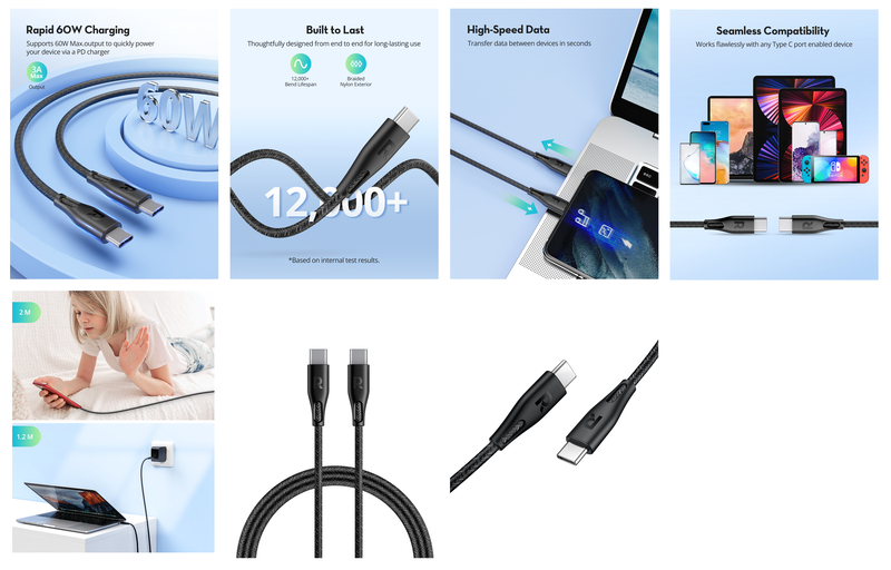 RAVPower Fast Charging 60W Type-C Cable 2m