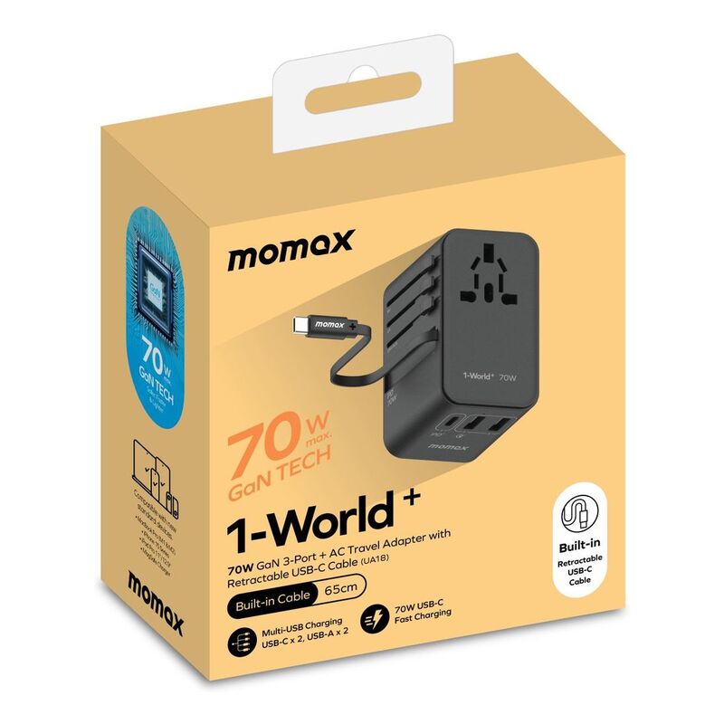 - Travel the world with confidence, charging your devices at lightning speedExperience the power of innovation with Momax's 1-World 70W GaN Retractable Cable Travel Adaptor (UA18). Engineered with cutting-edge GaN 3rd-generation technology, this sleek adaptor delivers a maximum power output of PD70W at a single port, revolutionising the way you charge your devices on the go.