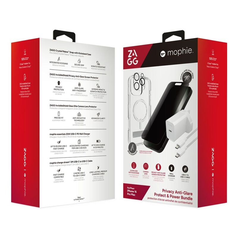 Zagg Crystal Palace Litesnapks/ Glass Eliteprivacy/Glass Elite Anti Glare Camera/ Cable & Power Bundle for iPhone 16 Pro