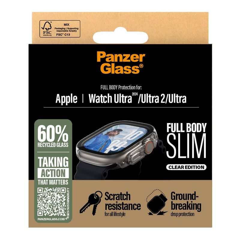 Bumping your watch against mountain rocks on mountain tops? Or hitting it against dripstones in underground caves? No worries! This scratch, shock, and drop-resistant full-body protection from PanzerGlass® is tougher than tough and keeps your watch safe from the hazards of an adventurous-and-not-so-ordinary life. It has even been drop-tested under 1 x Military Grade Standard conditions, which means it can withstand several drops from a height of 1.2 meters. The full-body protection is slim yet robust, protecting and prolonging the lifetime of your watch so that one day you can pass it on to someone else who will love it just as much as you do. This is one way of working toward a more sustainable future. Another is to use less packaging: In 2024, we reduced the amount of paper in our PanzerGlass core product packaging design by an average of 66%* and deliver all our products in recyclable FSC™-certified boxes. The full-body protector covers the entire front as well as the curved sides of your watch, while still providing easy access to all controls. It also has a smudge-free coating that reduces traces of fingerprints and grease. Installation is easy – just click on the screen protector and you’ll never again fear the screeching sound of glass against metal. This may never happen, but if it does, you’ll regret not having clicked “add to cart”. *Reduction from 2022-2024 measured by comparing selected products from the PanzerGlass® core range.