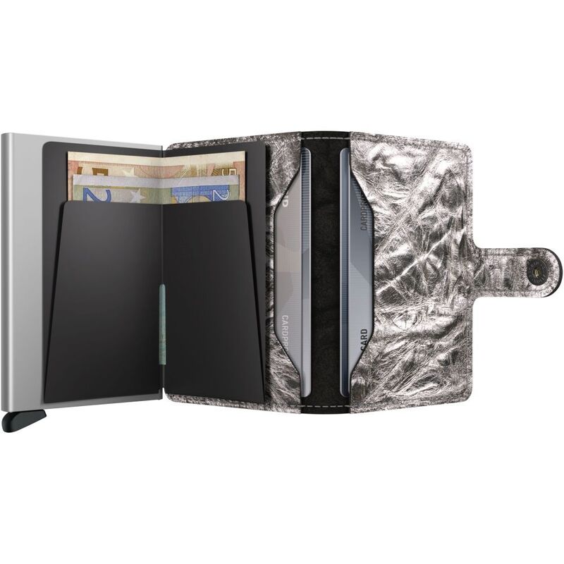 Small in size and surprisingly large in storage capacity, the Miniwallet combines the best of both worlds. The exterior holds banknotes, receipts and cards, while the aluminum Cardprotector allows you to slide out cards with one simple motion and protects them from bending, breaking and unwanted wireless communication.