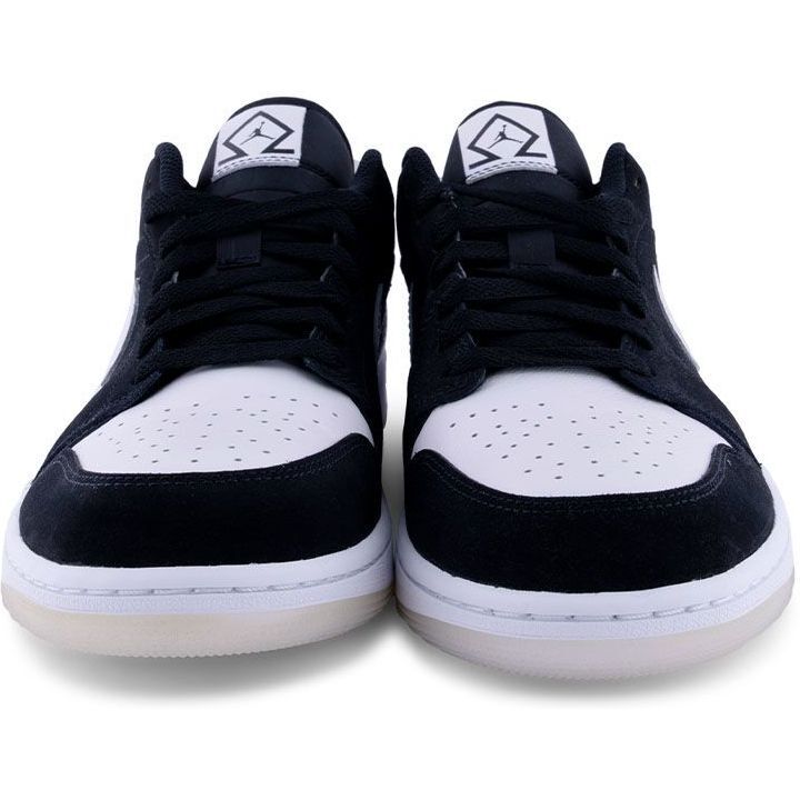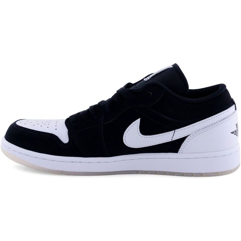 The Jordan 1 Low Diamond Shorts features an elegant black Durabuck and white leather upper in a classic color block, reminiscent of iconic Jordan 1s like Bred and Shadow. An Air Jordan Wings logo graces the heel, while the white midsole and semi-translucent outsole complete the exceptional look.