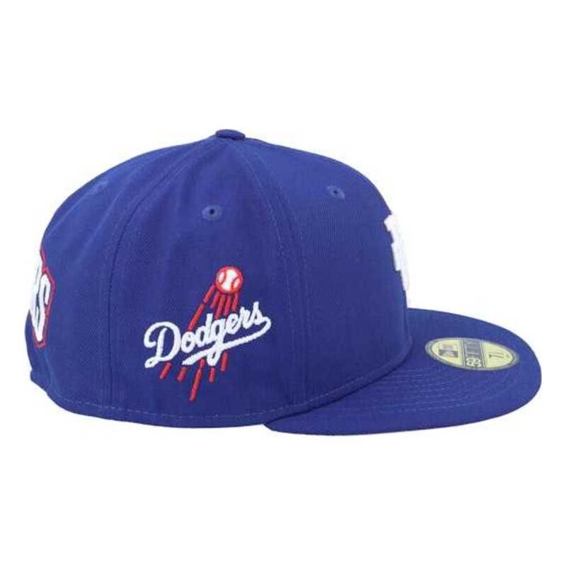 This New Era 59FIFTY Los Angeles Dodgers flat cap from the MLB Upside Down collection features a reverse-embroidered Dodgers logo on the front panels, the team name on the right and reverse, and the MLB Batterman and New Era flag embroidered on the left side.