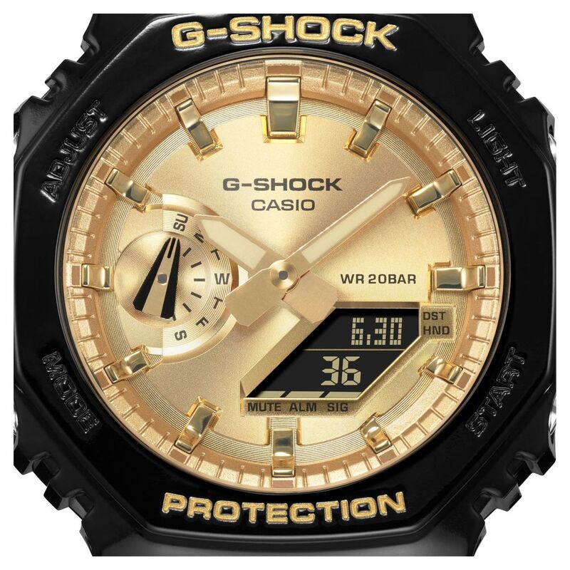 The polished gleam of metallic color and the iconic octagonal form of the DW-5000C, the original G-SHOCK, come together in a rugged digital analog combination timepiece measuring just 11.8mm from bezel to case back. A slim design with the same tough G-SHOCK construction.