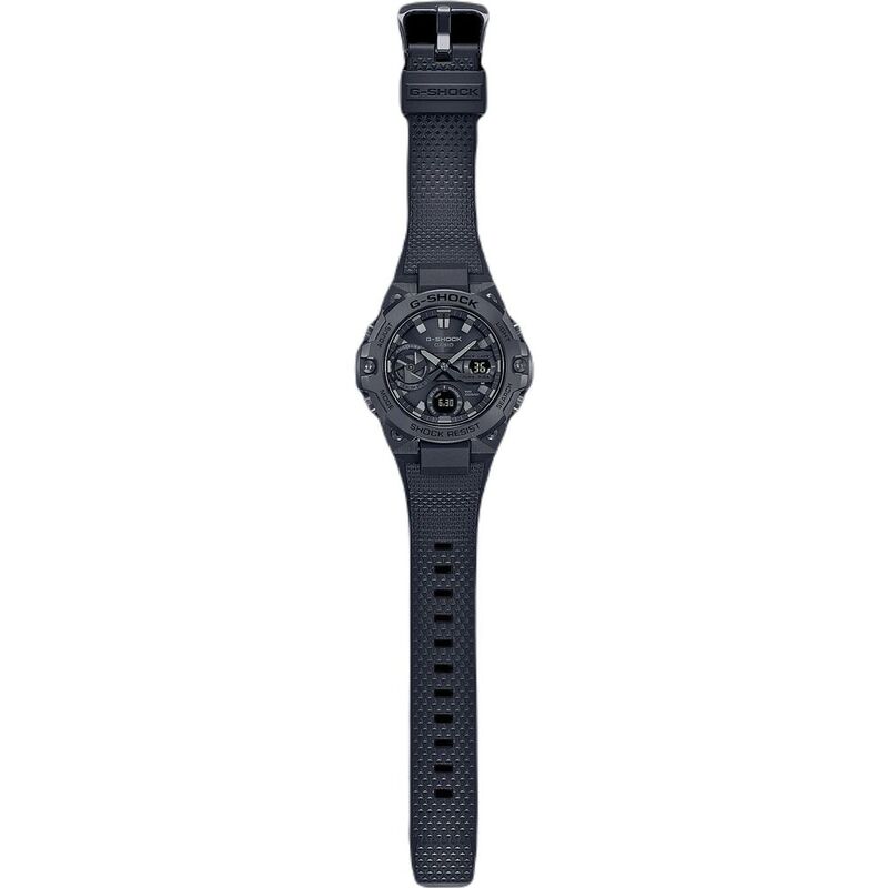 Tough construction meets stylish design in a black ion-plated metal bezel set against a base of jet black. With its slim combination module and Carbon Core Guard structure, the black-on-black take of the GST-B400 is a cool fashion statement ready for whatever you are.