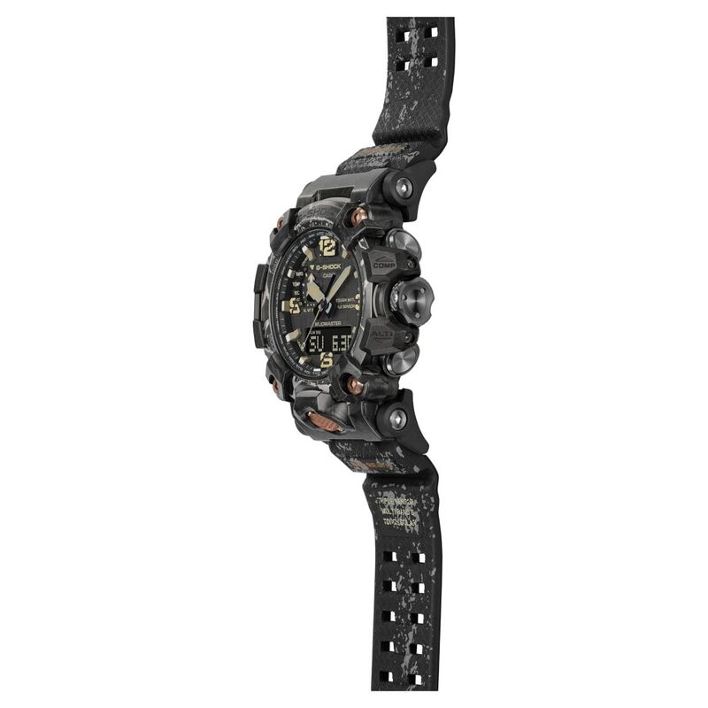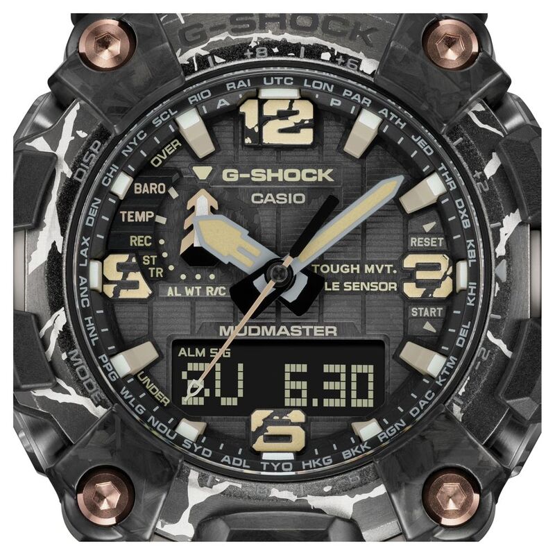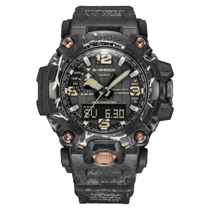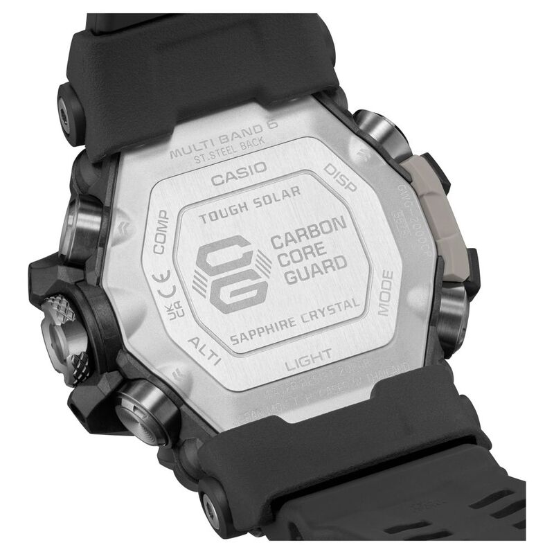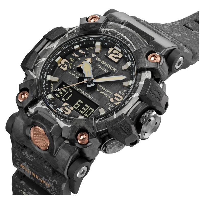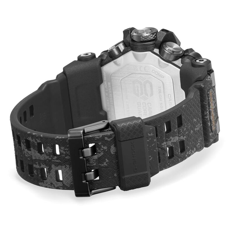 This shock-resistant watch is constructed to withstand all the mud and sand your adventures can bring while also delivering an even more comfortable fit. The compact design is made possible by the forged carbon bezel, Carbon Core Guard case structure, and mud-resist buttons combined with stainless steel pipes and silicone buffers. Finely powdered carbon fiber is kneaded into resin, then heat-pressed to mold a MUDMASTER bezel that is more complex and intricate, yet even stronger than before.