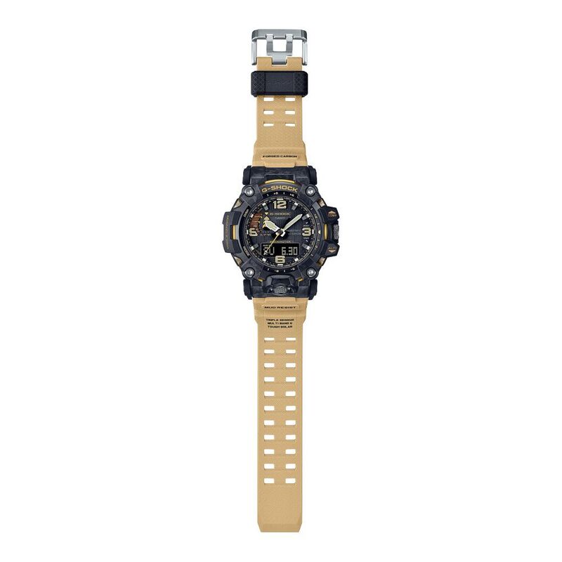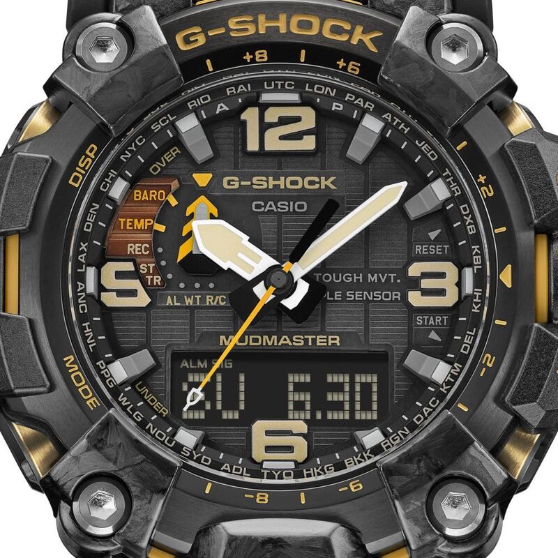 Take on the toughest terrain with the G-SHOCK MUDMASTER, designed to handle the harshest, roughest on-land environments.This shock-resistant watch is constructed to withstand all the mud and sand your adventures may bring, and it leverages our latest exterior technology to deliver a smaller profile with an even better fit.This compact design is made possible by the forged carbon bezel, carbon core guard case structure, and mud-resist buttons combined with stainless steel pipes and silicone buffers.