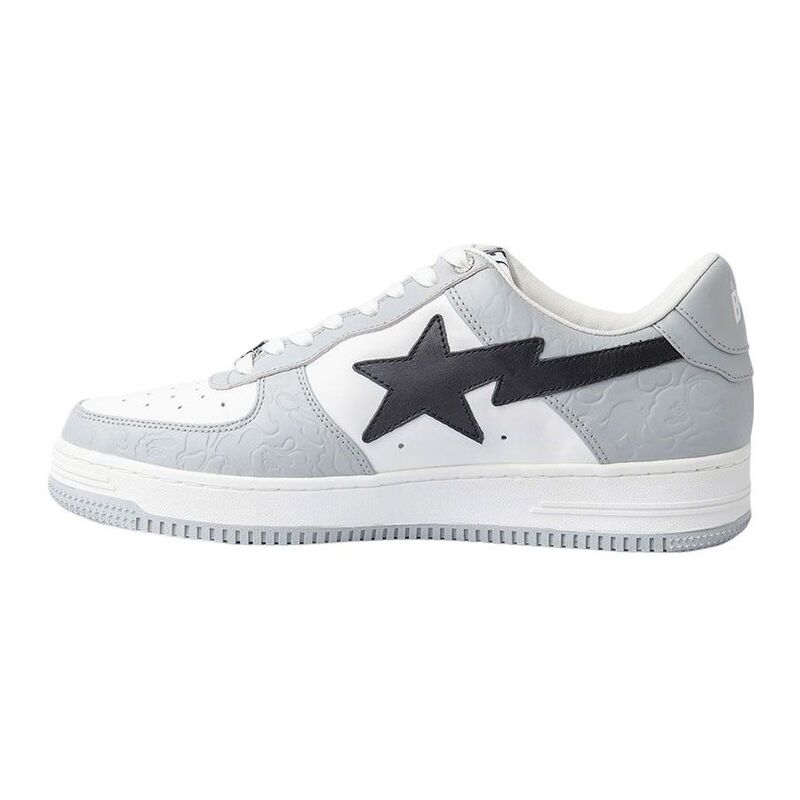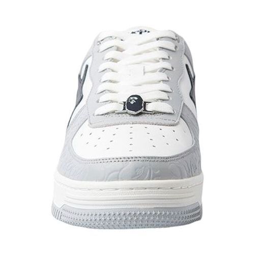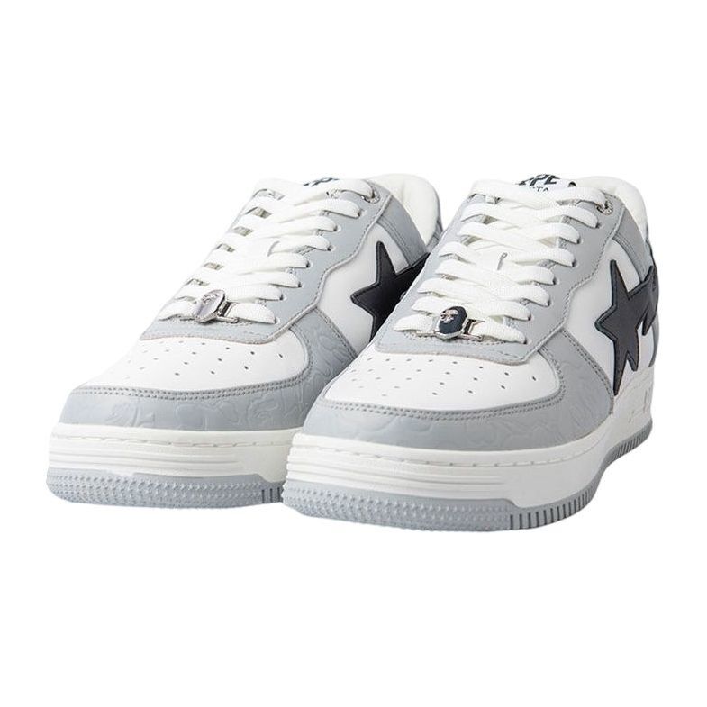 As the first sneakers produced by the rapper Kanye West, these sneakers boast a distinctive white, black, and gray colorway, adorned with a star-shaped “STA” logo on the sides, with BAPE logo and metal charm accent adorning the design. They are crafted from premium leather, perforated on the sides and toe for breathability.