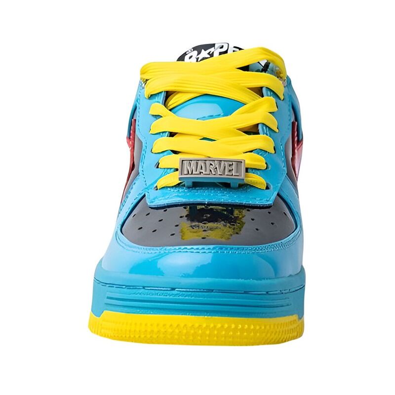 Inspired by the Marvel character Dr. Strange, these sneakers feature an eye-catching design, with blue, black, and red colorways. The upper is made of shiny patent leather in a blue and black red. The striking Dr. Strange graphic and Marvel branding adorn the design, complemented with a red star logo and the embroidered BAPE STA branding.