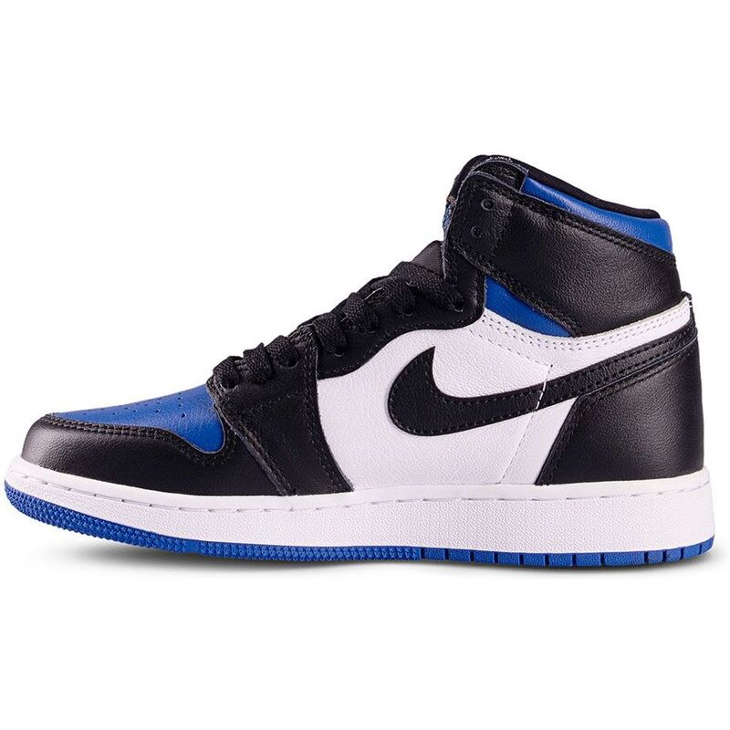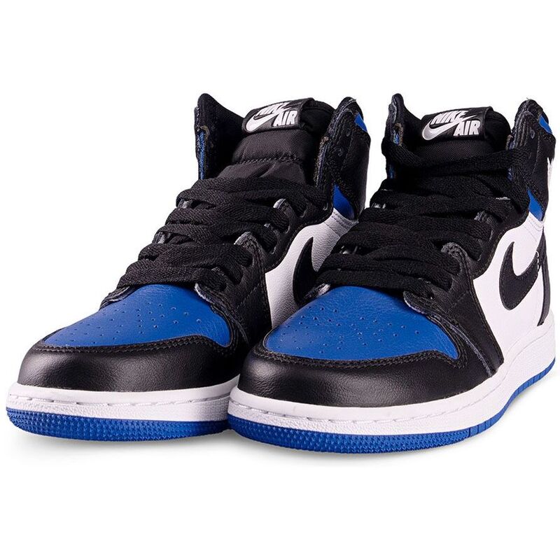 These sneakers are crafted from premium leather, featuring a crisp white base enhanced by striking black overlays and vibrant Game Royal accents. A softly padded black nylon tongue adorned with a Nike Air tongue tag complements the design, while the quintessential Jordan Wings logo adds a touch of heritage to this sophisticated ensemble.