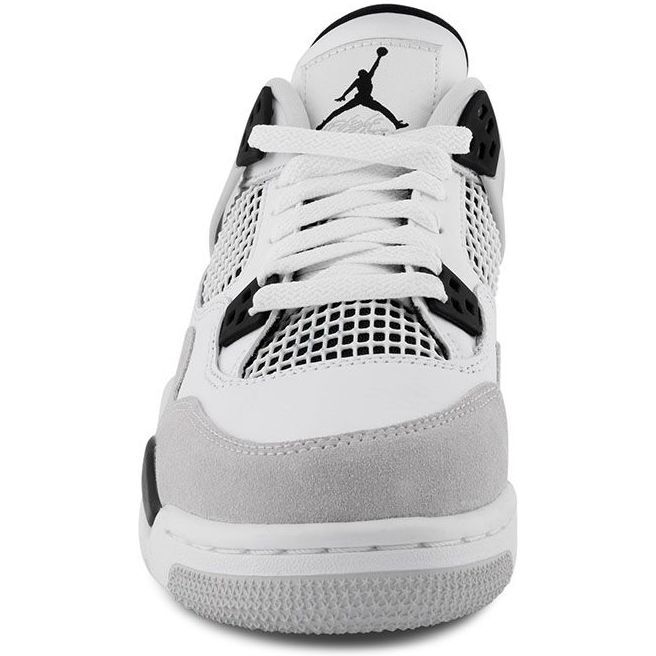 These sneakers mirror the OG 1989 ‘Military Blue’ colorway. They feature smooth white leather with a grey suede forefoot overlay and black accents on the TPU eyelets, molded heel tab, and iconic Jumpman logo, while the two-tone polyurethane midsole with a visible Air-sole unit in the heel provides lightweight cushioning.