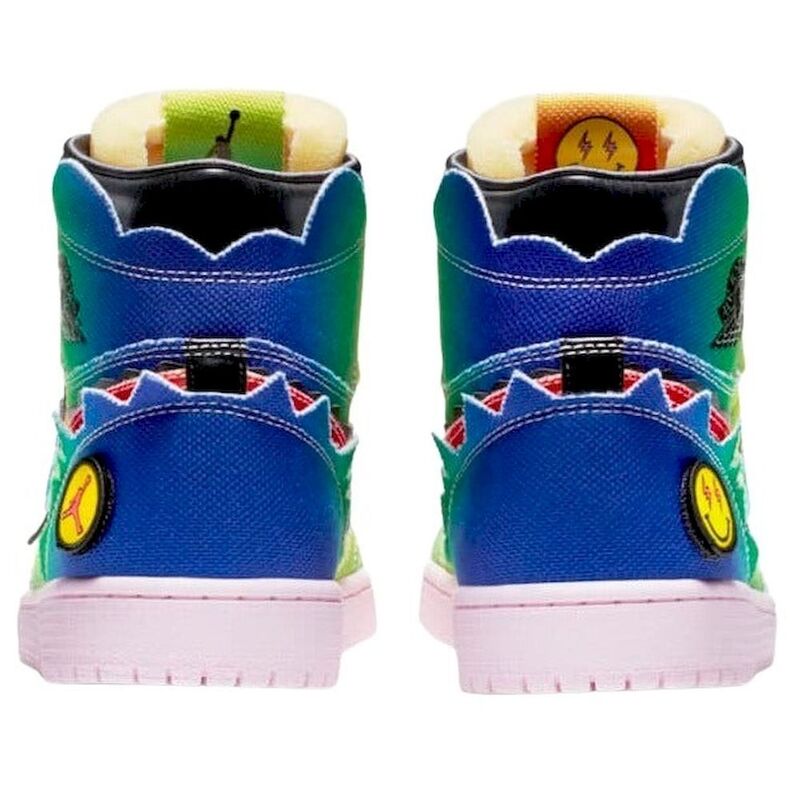 These sneakers offer a vibrant, DIY-inspired makeover, featuring a colorful textile upper with rough cut edges, pastel pink on the exposed-foam tongue and rubber cupsole, and black accents on the collar, laces, and modified Wings logo. Removable Velcro patches on the heel allow for customization with a basketball, J Balvin’s iconic face, or a Jumpman branding.