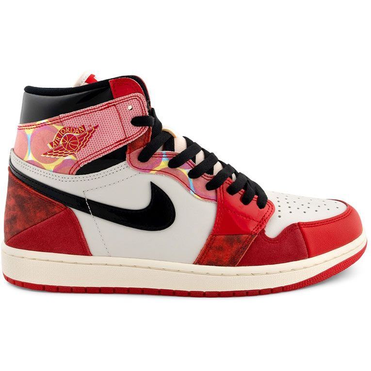 These sneakers reimagine the ‘Chicago’ colorway with a nod to 'Spider-Man: Across the Spider-Verse.’ They feature a white leather upper, black patent leather collar and Swoosh, and scarlet overlays with various textures. With Wings and Nike logos gracing the design, this high-top sits on a rubber cupsole with vintage sidewalls and a crimson semi-translucent outsole.