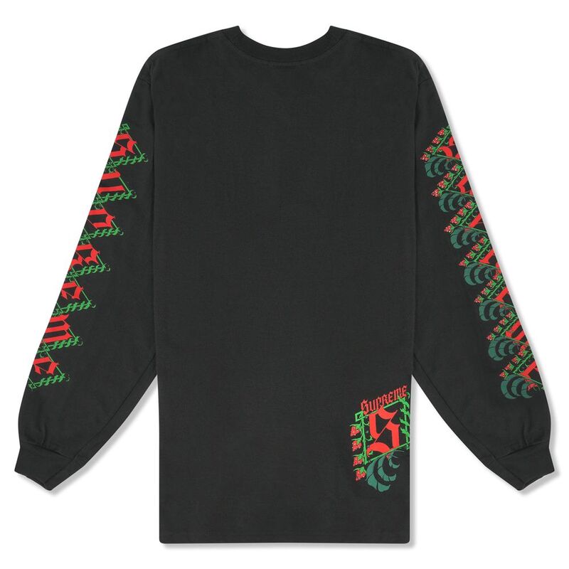 The Supreme Strawberries Long Sleeve Tee in black showcases a bold take on the word "Supreme," with each letter filled with a repeating pattern of vibrant red strawberries accented by green details. This eye-catching design extends down both sleeves, adding a dynamic and cohesive look.