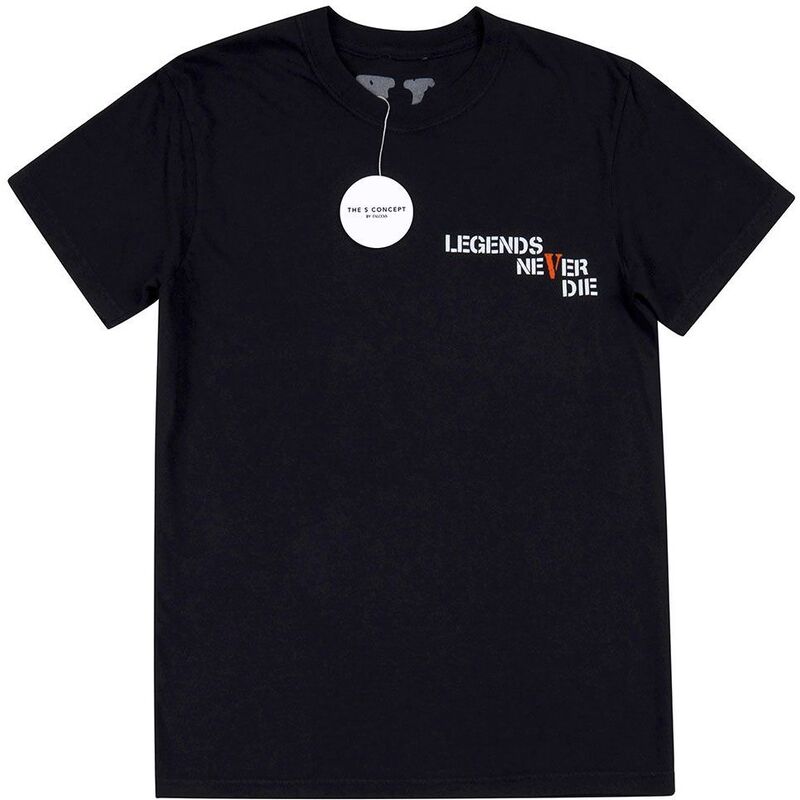 This t-shirt is adorned with the timeless mantra "Legends Never Die" in elegant white lettering on the front left chest. The iconic Vlone "V" logo is seamlessly integrated into the phrase, echoed in a larger scale on the back of the shirt. This design pays homage to the late artist's legacy, incorporating the number "1000" into the graphic.