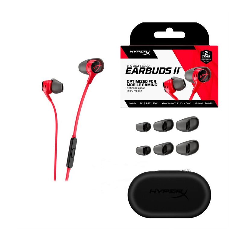 You don’t have to wear a headset to take your gaming seriously. If you demand quality audio and convenient portability, the HyperX Cloud Earbuds II have got you covered. With 14mm drivers optimized for mobile audio, you’ll have a great listening experience whether you’re gaming, watching videos, or listening to a good audiobook or podcast. 4 sets of redesigned ear tips will help ensure you get the right fit for your ear. The Cloud Earbuds II also feature a low-profile 90° cable to help you avoid snags, as well as a helpful hard carrying case. For busy multitaskers, the built-in microphone allows you quickly swap from mobile gaming to answering phone calls with a touch of the multi-function[3] button. These versatile earbuds are compatible with PC[1], Nintendo Switch, Steam Deck™, and mobile devices[2] that use a 3.5mm connection.