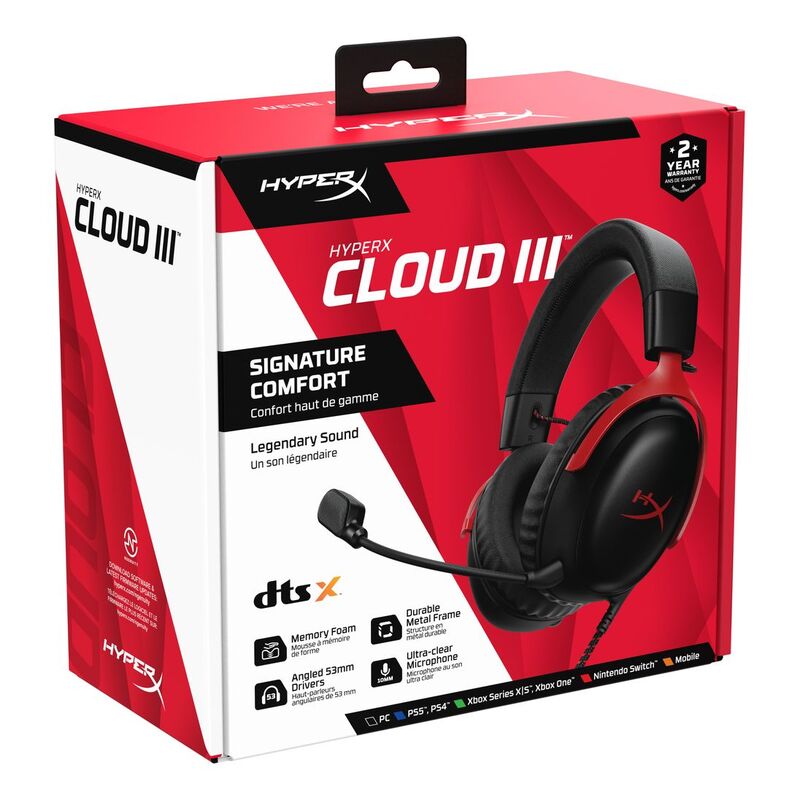 The HyperX Cloud III is an evolution of our legendary Cloud II, which is known for its comfort, sound quality and durability. With plush HyperX signature memory foam in the headband and ear cushions, it provides a comfortable fit perfect for long gaming sessions. It also features new, retuned 53mm drivers that are angled for an optimal listening experience. The upgraded 10mm microphone captures crystal clear in-game voice chat and calls. Simple controls on the headset earcup allow you to have quick, direct access to mute your mic or adjust audio volume. The LED mic mute clearly shows when you’re muted. Compatible with PC, PS5, Xbox Series X|S, Xbox One, Nintendo Switch, Mac, and Mobile. Experience ultimate comfort and sound across your favorite platforms.
