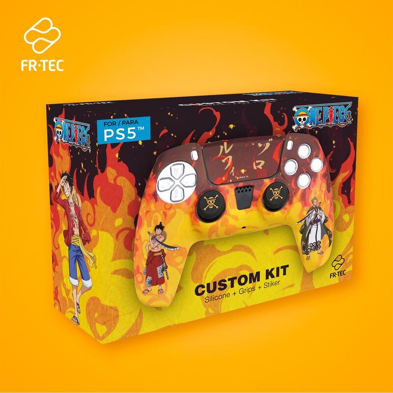 The One Piece™ Custom Kit Fire for PS5™ features an eye-catching fire design rising from the silicone base! The horns illustrate the beloved Luffy and his loyal partner Zoro. On the grips is the pirate skull from the One Piece™ saga. Touchpad sticker has the design of the characters names in kanji!