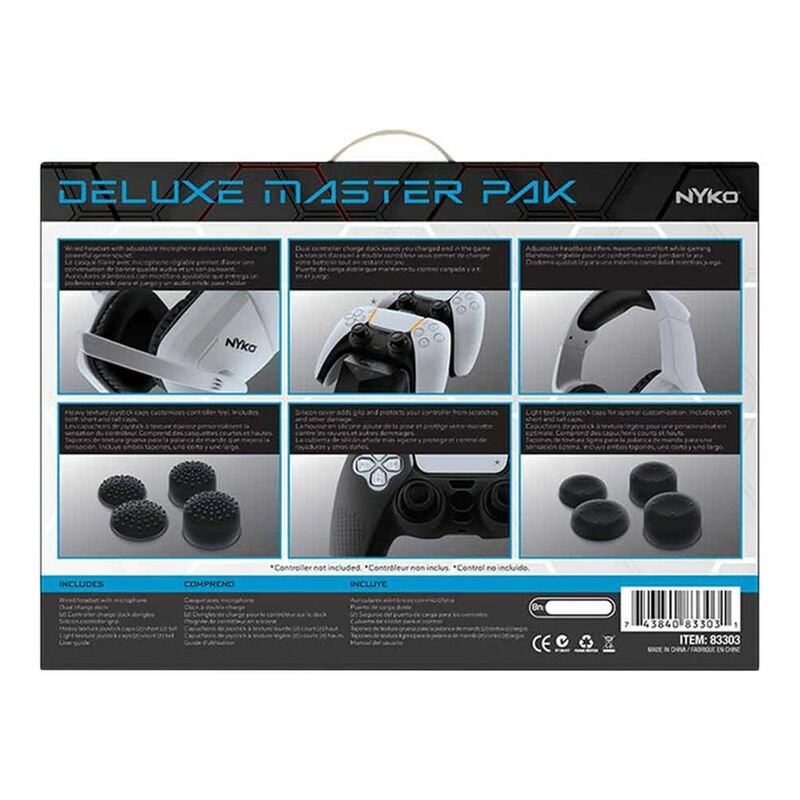Nyko's Deluxe Master Pak is the perfect premium starter kit for the PlayStation5. Included is a wired tactical headset with inline volume controller for easy volume controller control. Easily dock 2 controllers into the included charge dock. The included grip cover provides added comfort for extended gaming sessions. The 8 thumb stick caps optimize controller ergonomics for precision.