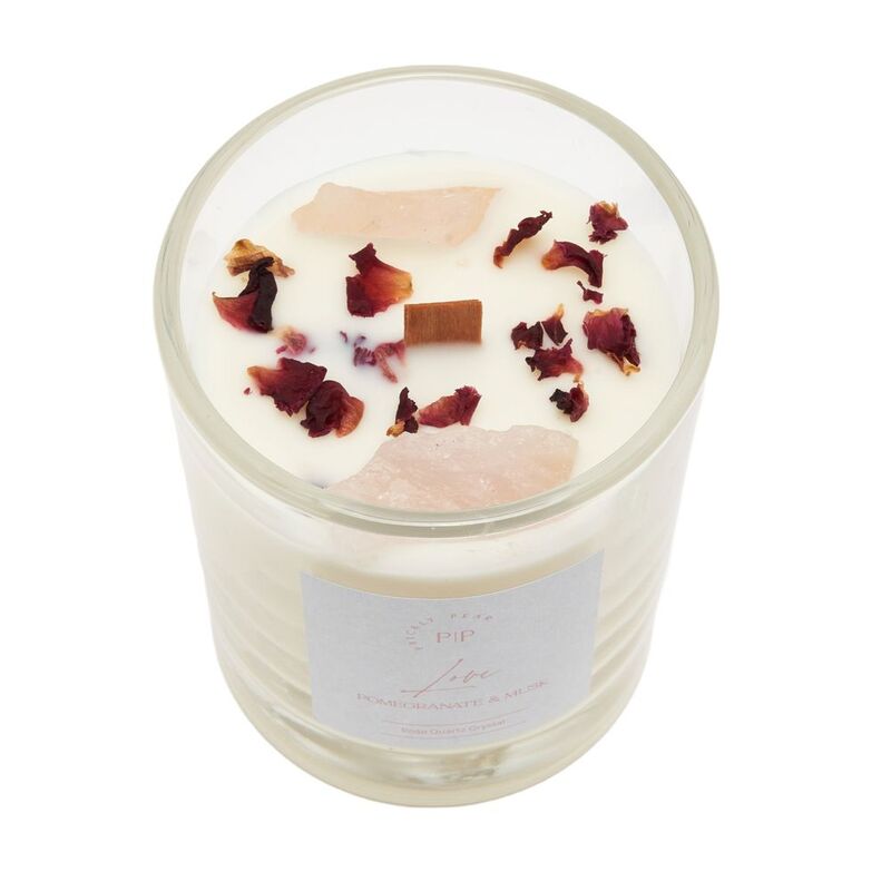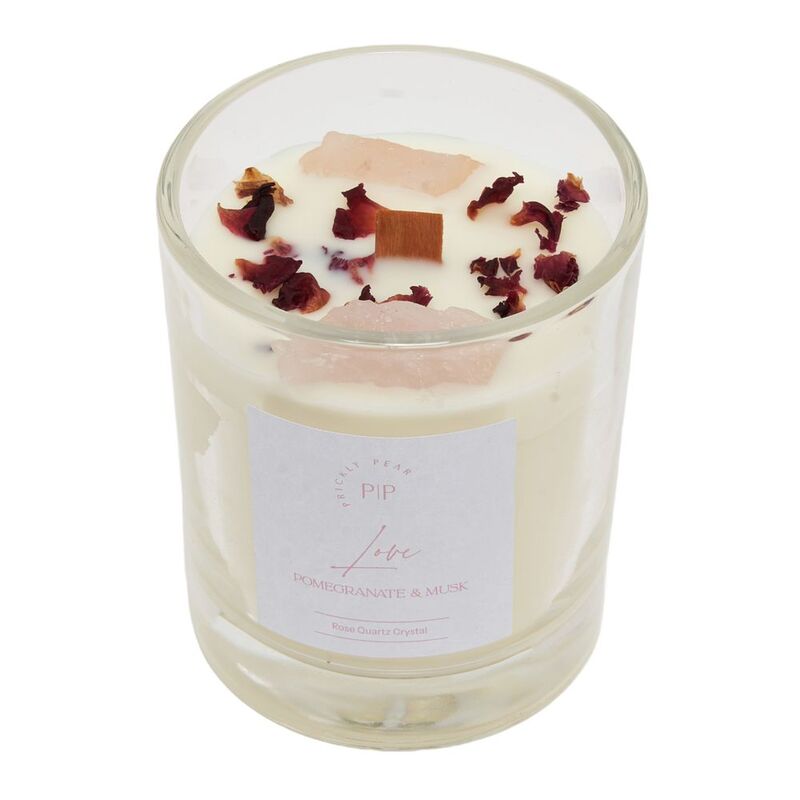 The Love Crystal Candle is a celebration of the many ways love shows up in your life. The scents of Pomegranate and Musk evoke a sense of deep warmth. The Rose Quartz crystals set in the middle of the candle act as a reminder to keep your heart cleansed, to let go of anger and hold on to love.