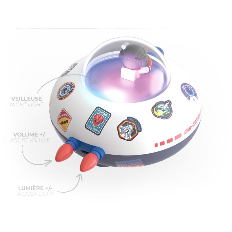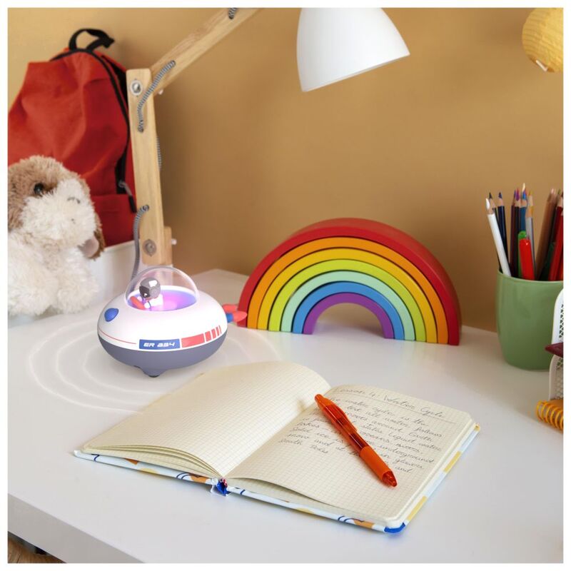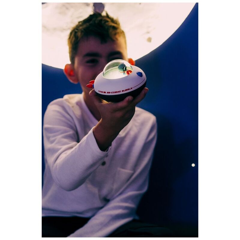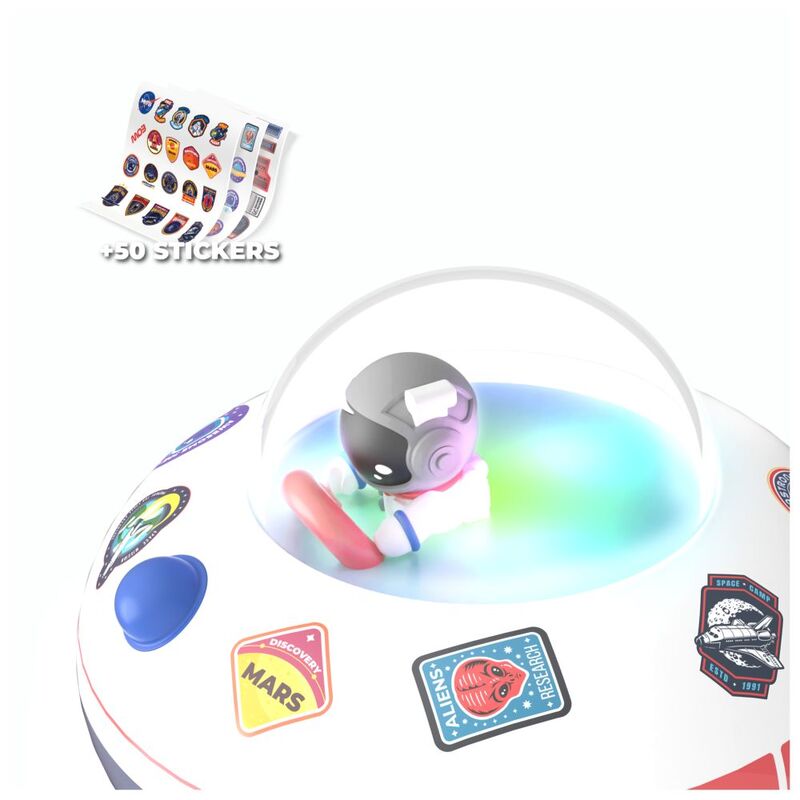 Soar into the world of sound and light with the Cosmo Bubbly. This Bluetooth speaker shaped like a spaceship combines cutting-edge assembly, a futuristic, playful design, and powerful sound. It features 4 hours of lighting effects and a powerful audio experience. Perfect as a nightlight, it offers soothing ambient lighting with 3 modes. Personalize the speaker with 50 included stickers. Get ready for your next mission to Mars!