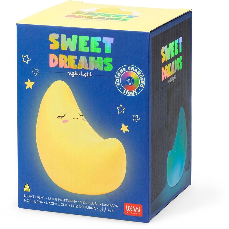 When night falls, dreamland calls. Legami’s Sweet Dreams - Moon - Night Light is ideal for chasing scary shadows out of your child's bedroom. The multicolour light gradually cycles through its 4 shades with a full 20 hours of battery life!