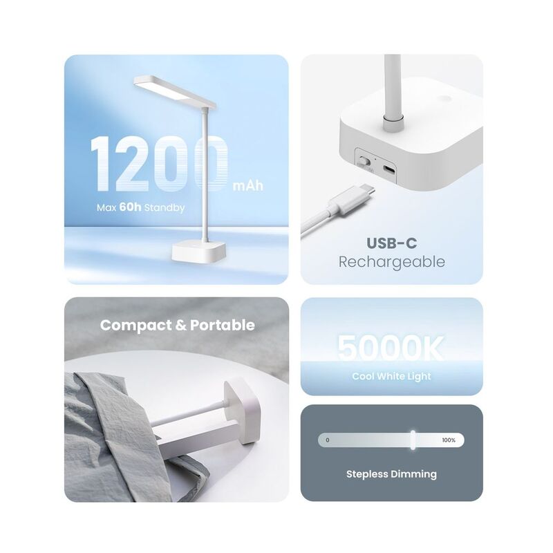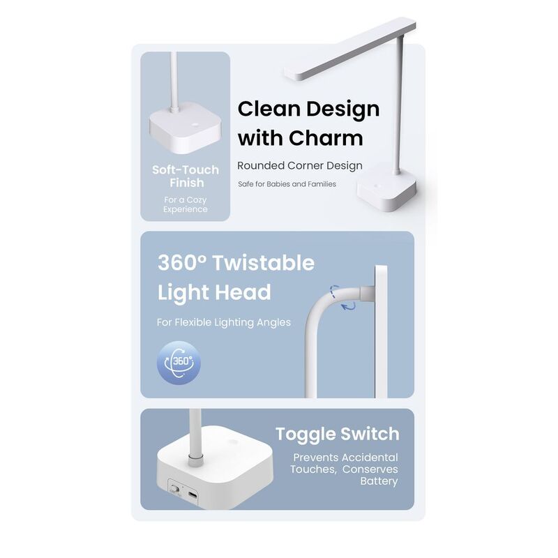 • Adjustable Lighting: 360° twistable light head, Flicker-free LED, Nightlight mode