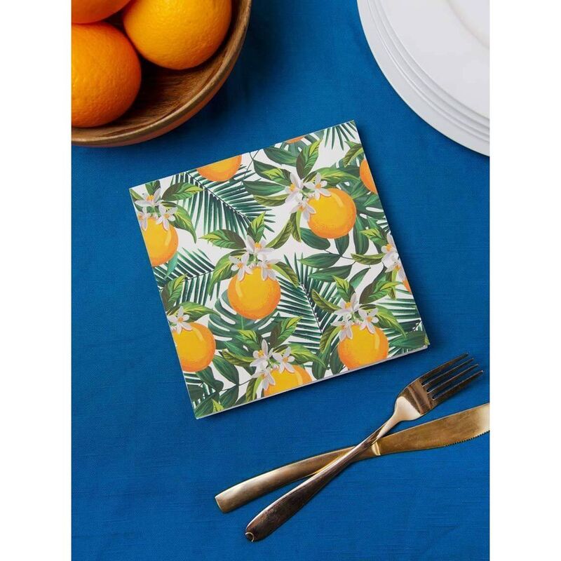 Tropical Palm Leaf and Oranges Paper Napkins by Talking Tables. This pack of 20 home compostable and recyclable napkins will add a citrus pop to any table. The perfect party tableware for a dinner party, summer birthday, picnic,