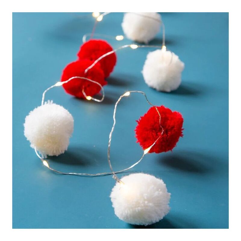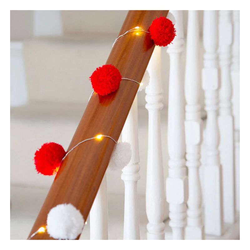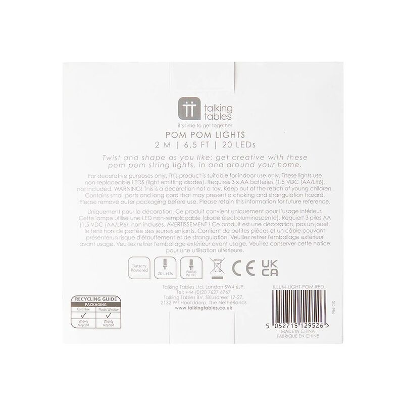 These colourful Red and White Pom Pom String Light by Talking Tables are the perfect addition to your festive décor! Use as Christmas decorations for your dinner table, mantlepiece, banister, bedroom or table centrepiece! Each pack contains a 2m (6.5ft) wire with 20 LED lights and red and white fabric pom poms.Size: 2m (6.5ft) lengthBattery type 3 x AA, batteries not included.