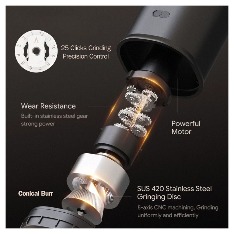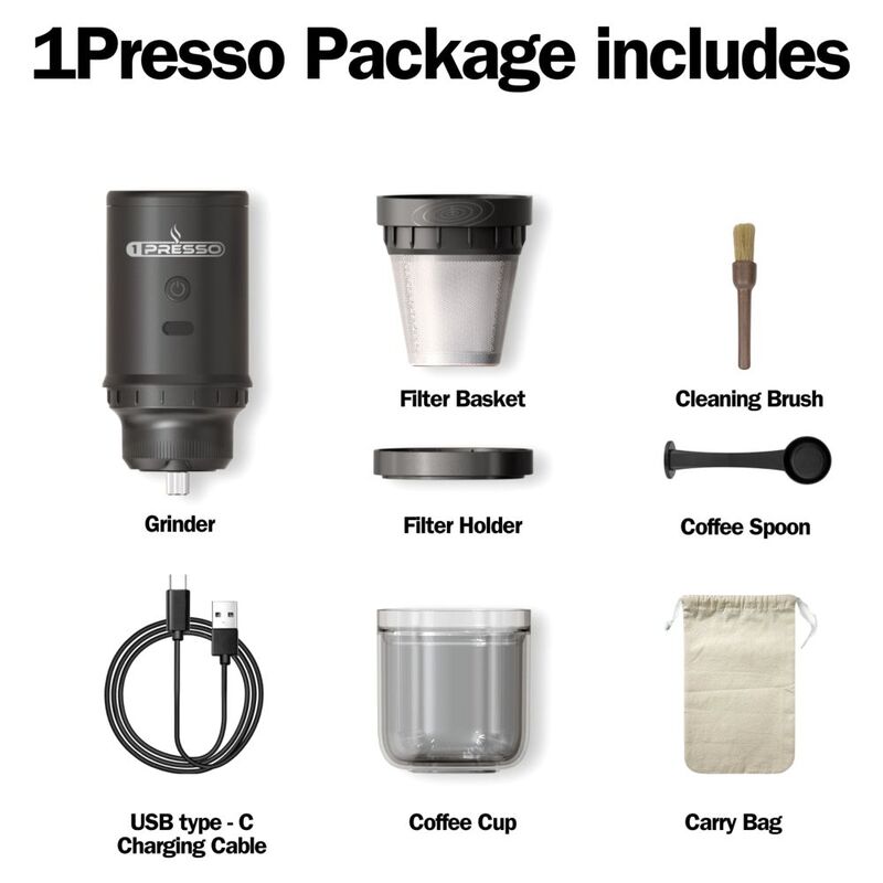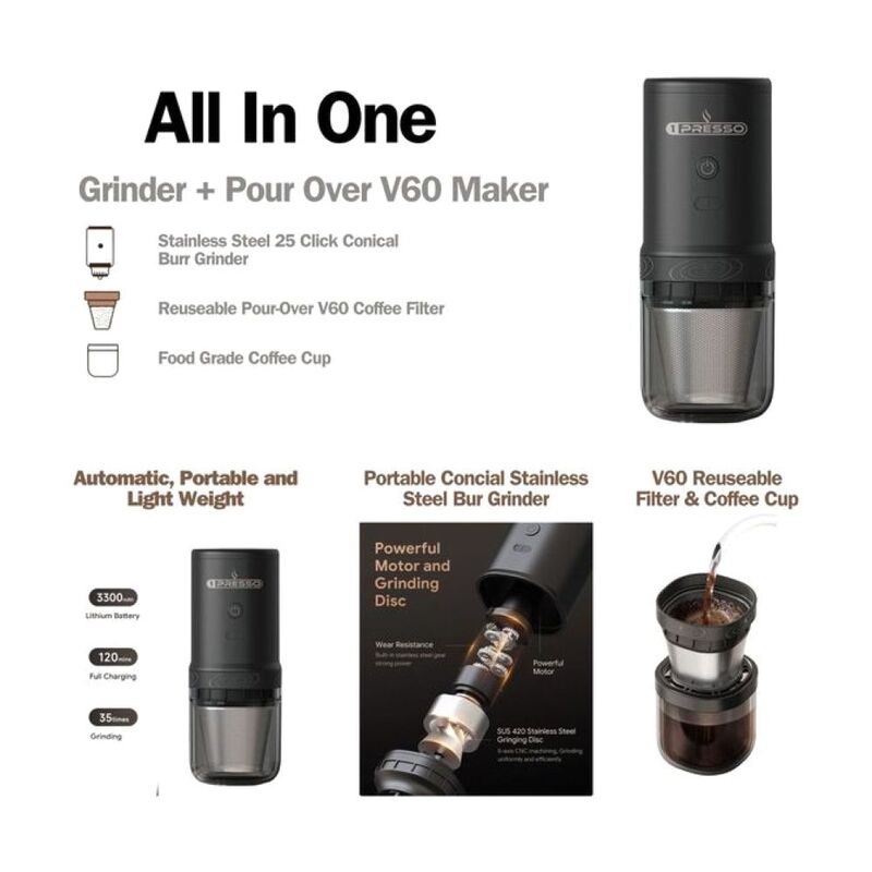 1Presso Portable Coffee Grinder and V60 Coffee Machine - Stainless Steel Conical Burr With 25 Grind Setting, Reuseable V60 Filter and Cup, For Travel, Outdoors, Office & Home (Black)