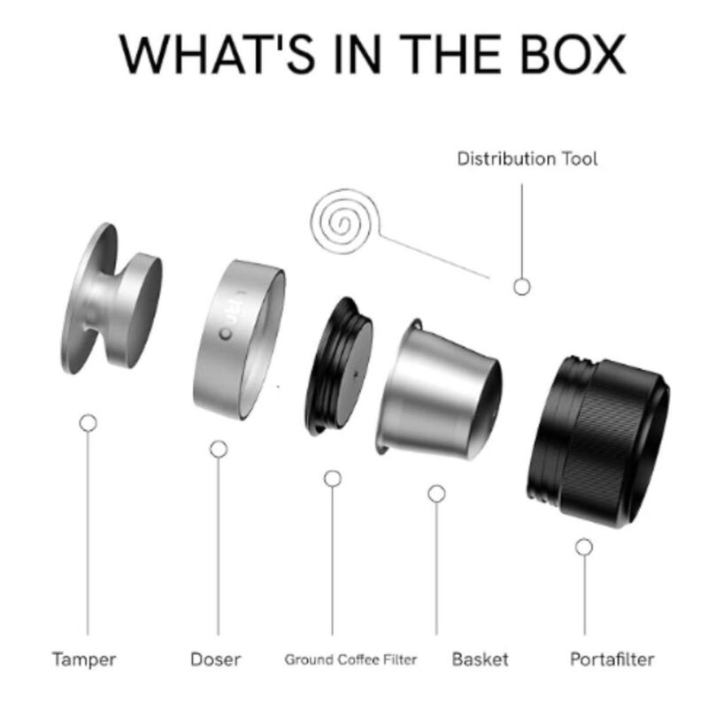 Accessories designed to unlock the full potential of the Outin Nano capsule espresso machine. The set includes a tamper, dosing funnel, filter for ground coffee, portafilter, and distributor.