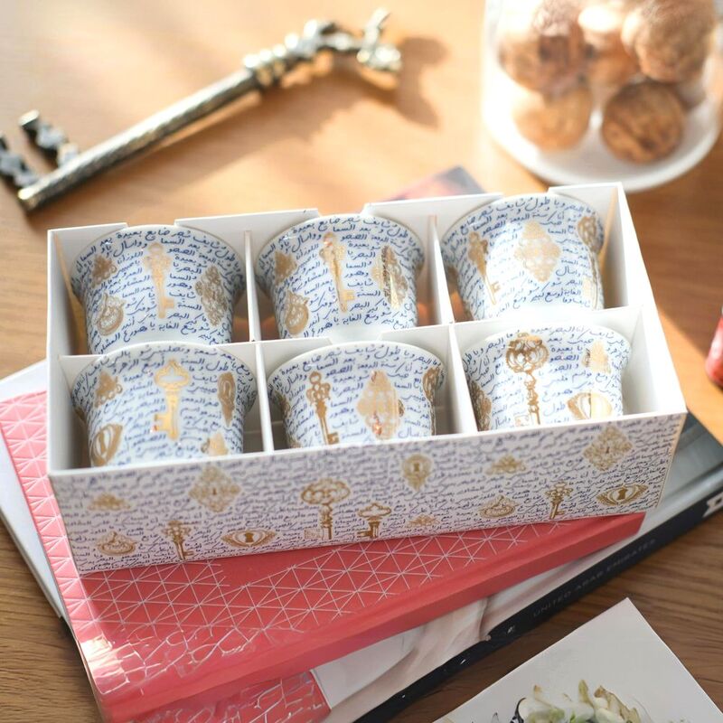 Sip love from the Nagham Arabic Coffee Cup Set of 6. Encased in a chic Silsal box, each porcelain cup features intricate key motifs in 22K Gold and lyrics inspired by an amazing Arabic song. Ideal for hosting or gifting, these cups eloquently express love with their adorable words, while the design itself adds an extra layer of artistic Arabic sophistication and love to your gatherings.